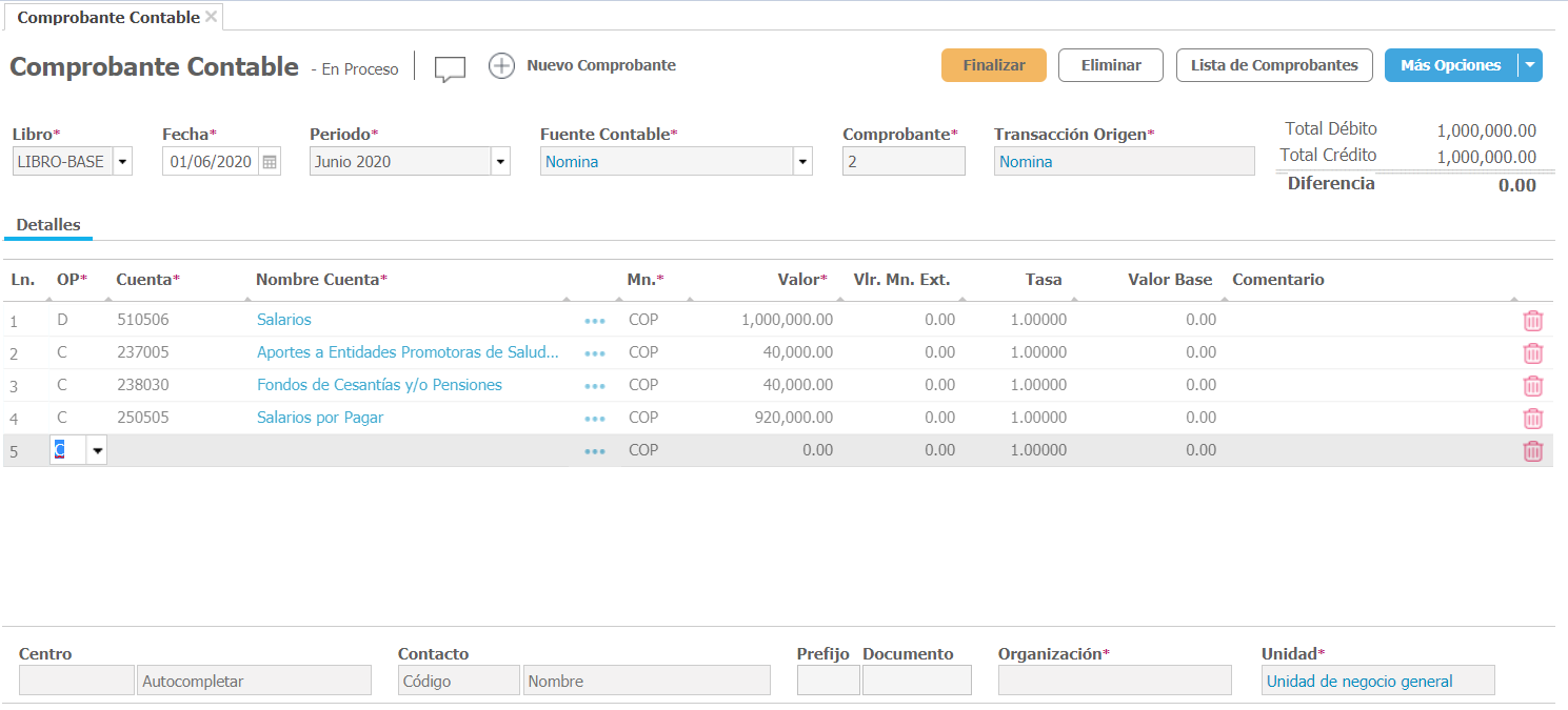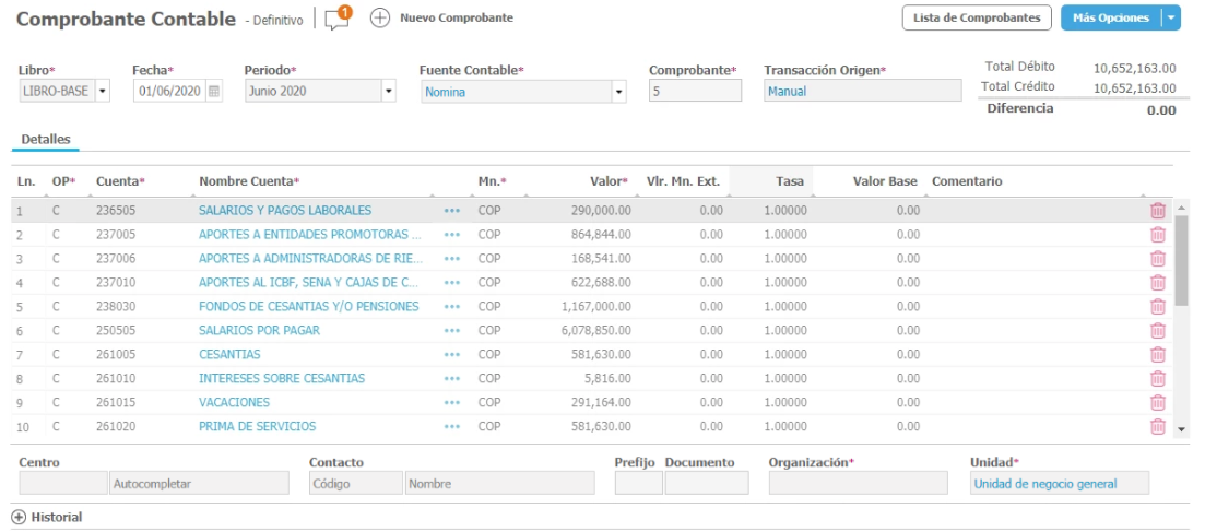 Nota: También puedes crear un comprobante contable para discriminar: Nómina, otro para Provisión de prestaciones sociales y autoliquidación (pago de seguridad social), esto con el fin de poder consultar por tópicos puntuales.