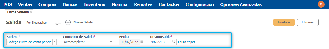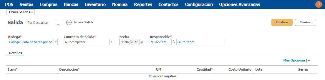 - Responsable: Debes indicar que usuario es el responsable de la salida de inventario que se esta efectuando. De forma predeterminada el sistema te muestra el usuario que esta logueado en la aplicación pero puedes modificarlo.