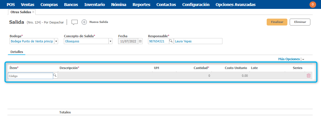 - Una vez ingresados todos los ítems, puedes finalizar la salida de inventario para esto presiona el botón Finalizar.