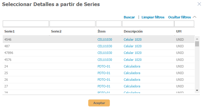 - En la tabla de detalles se recuperan todos los ítems con sus respectivas series previamente marcadas.