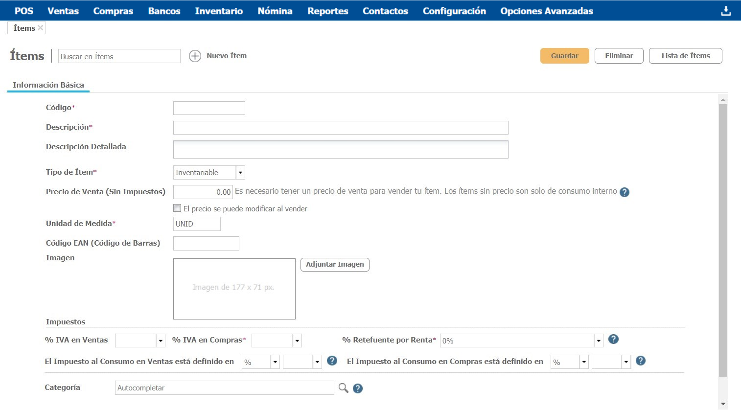 La creación de Ítems la puedes realizar por Inventario → Ítems.
