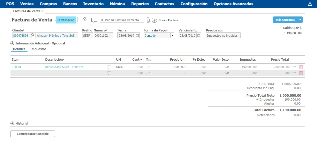 Si una factura de venta se encuentra en estado En Validación, no se ha generado contabilización del mismo, ni actualización del estado de cuenta del cliente, además si manejas inventario aún no se efectúa la salida de la mercancía.