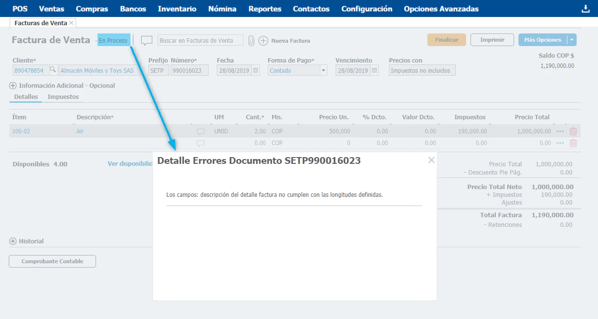 - Si se presentó algún inconveniente realizando la validación por parte de la DIAN, la factura de venta volverá a estado En Proceso y el sistema te mostrará los errores presentados para que realices la corrección y finalices nuevamente el documento.