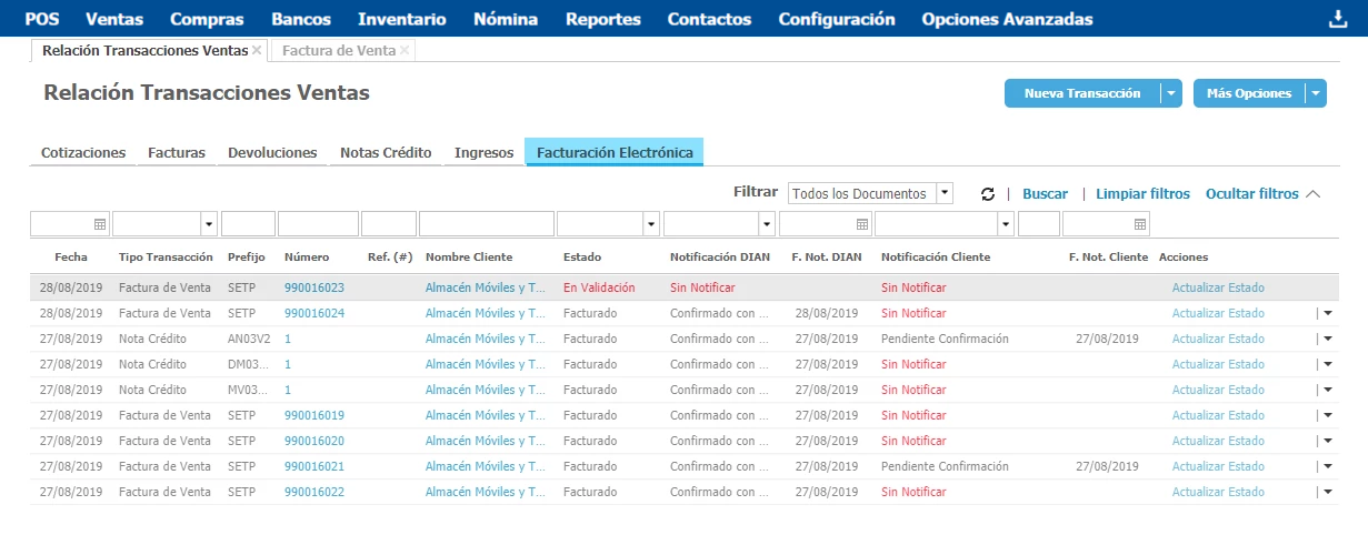 Recuerda que en Ventas → Relación de Transacciones Ventas puedes verificar la lista de todos los documentos que has generado con su respectivo estado.