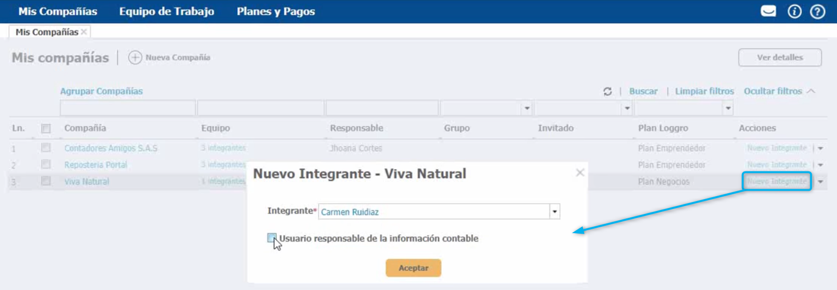 Nuevo Integrante: Desde allí podrás asignar permisos a tu equipo para controlar qué persona es la responsable como contador o auxiliar contable de cada uno de tus clientes.