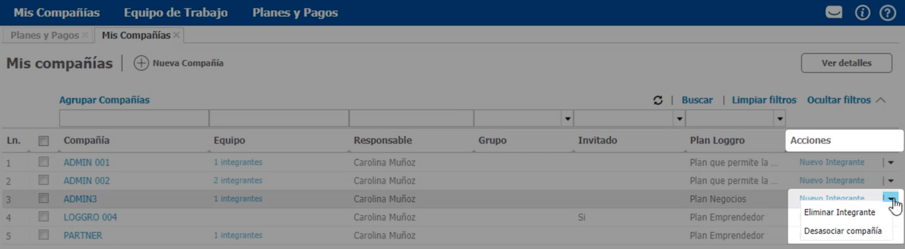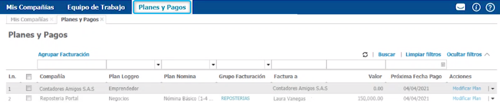 Verifica los planes adquiridos para cada una de las compañías que tienes asociadas en el portal.