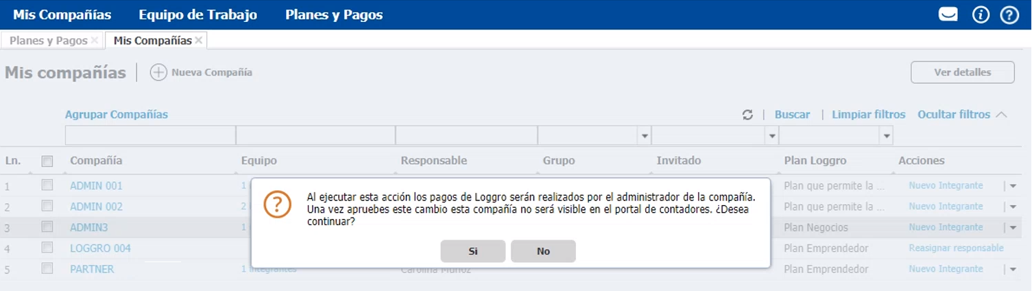 Si das clic en esta acción para alguna de las compañías, el sistema te muestra un mensaje notificando que los pagos del sistema quedarán a cargo del administrador de la compañía y que esta ya no aparecerá en tu portal de contador aliado.