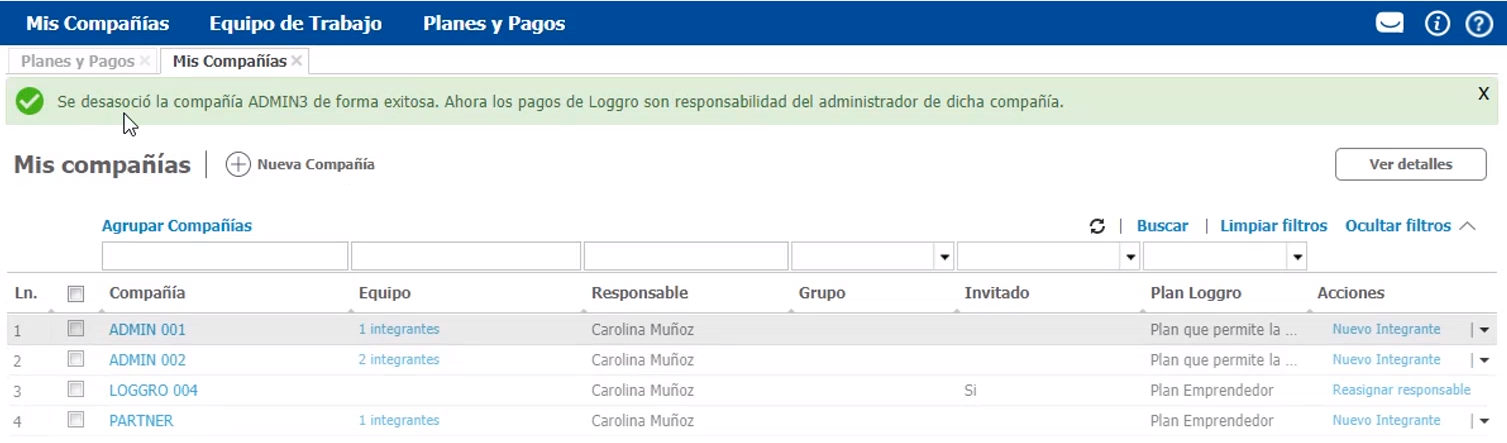 Al dar clic en Si, se muestra la confirmación del proceso de desasociar la compañía seleccionada y esta ya no aparece en el portal (para nuestro ejemplo la compañía ADMIN3)
