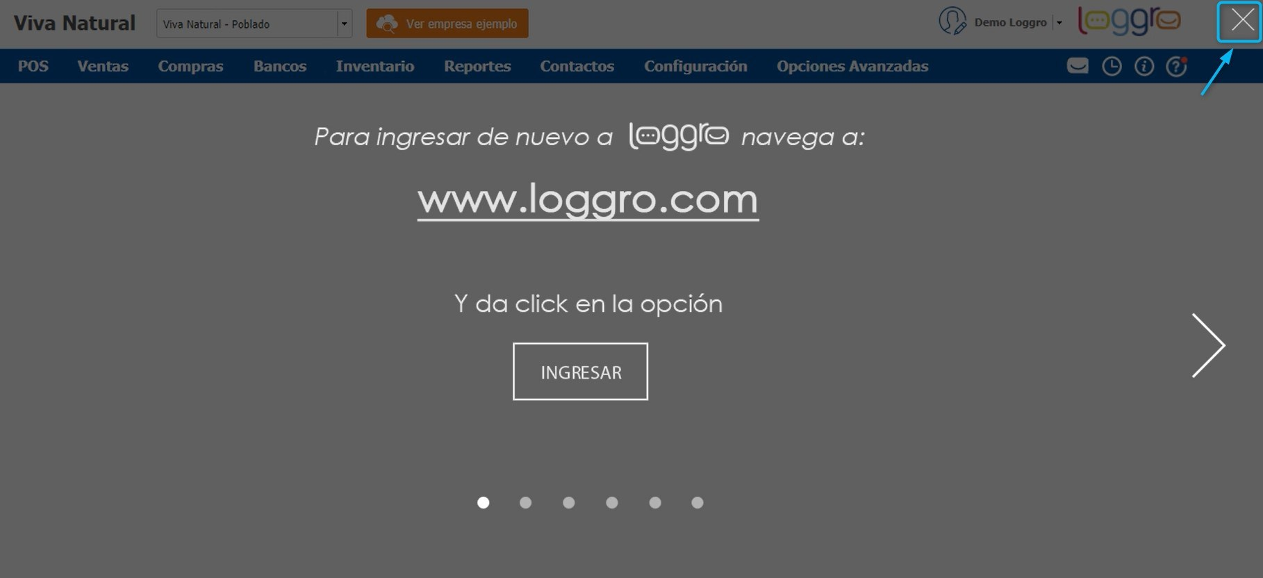 Al finalizar la configuración inicial e ingresar a Loggro puedes visualizar una ventana con la bienvenida al sistema y los primeros pasos, puedes verificarlos dando clic en la flecha > o cerrar la ventana dando clic en la X.