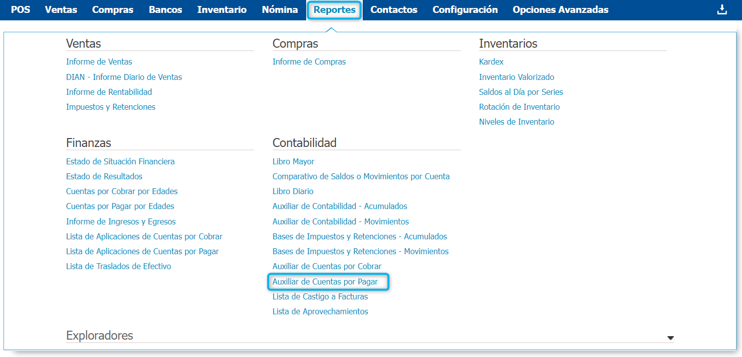Para acceder a este reporte debes seguir la siguiente ruta Reportes → Auxiliar de Cuentas por Pagar