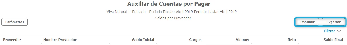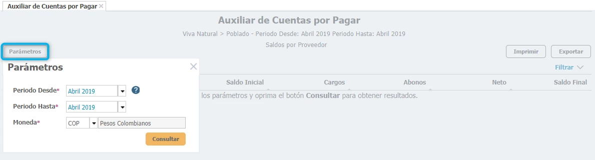 Para realizar la consulta por periodo, debes generar Saldos a corte de Cuentas por Pagar para el periodo a consultar. Los saldos a corte se generan desde Opciones Avanzadas → Generación de Saldos a Corte.
