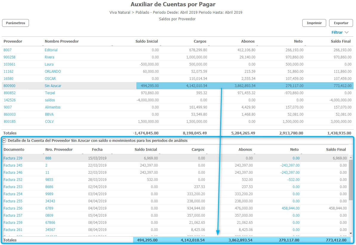 Al hacer clic en los valores del proveedor en la parte inferior se muestran los documentos asociados que consolidan dichos saldos.