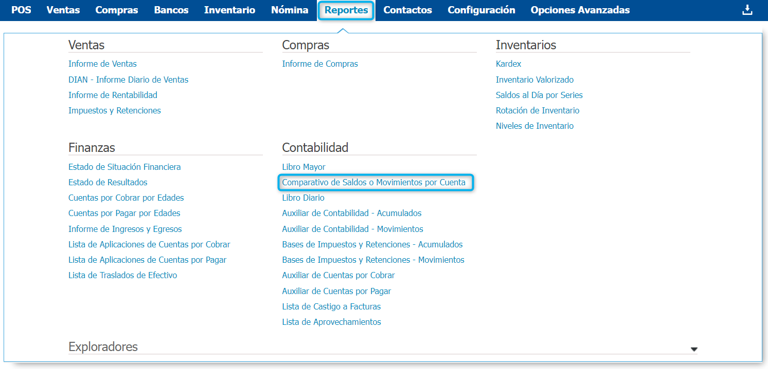 Para ingresar al informe debes dirigirte a Reportes → Comparativo de Saldos o Movimientos por Cuenta