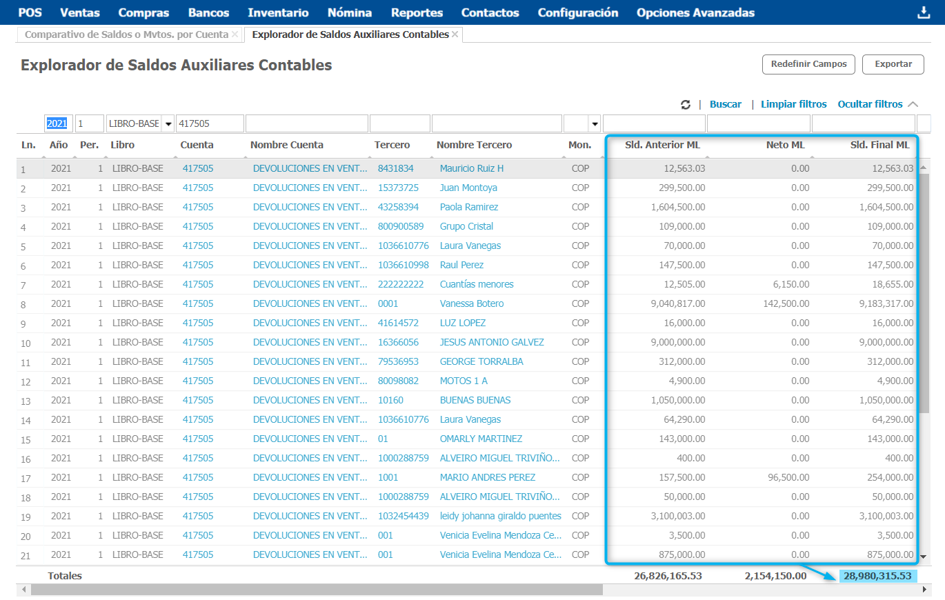 Para cada uno de los saldos que se evidencian en este reporte puedes consultar los movimientos asociados, solo debes dar clic en el campo denotado en color azul.
