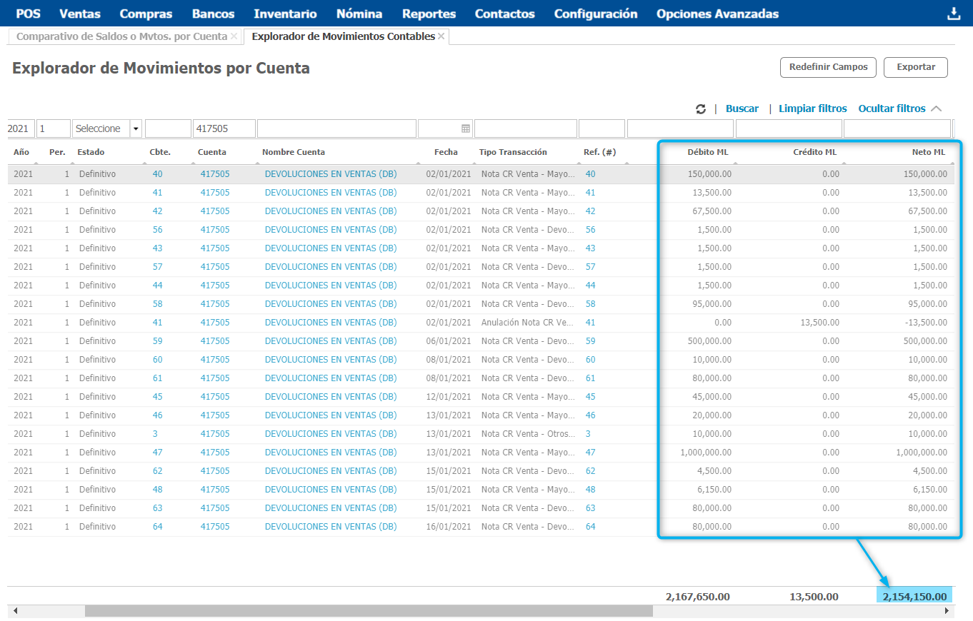 En este ejemplo vamos a verificar el saldo de Enero/2021 para una cuenta contable de Devoluciones en Venta. Al dar clic en el campo señalado, el sistema muestra la información del Explorador de Saldos Auxiliares Contables con el detalle.