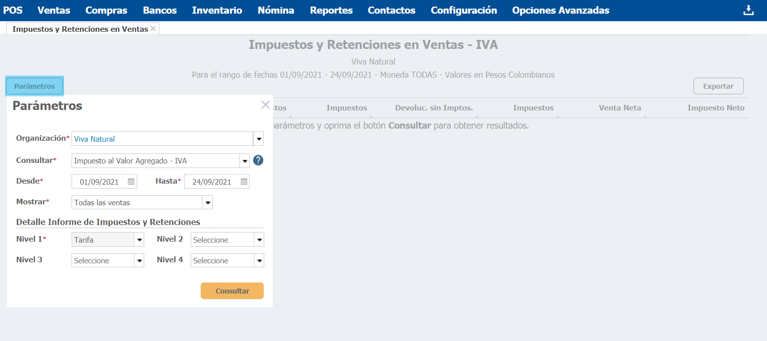 Para realizar la consulta debes ingresar a Reportes → Impuestos y Retenciones.