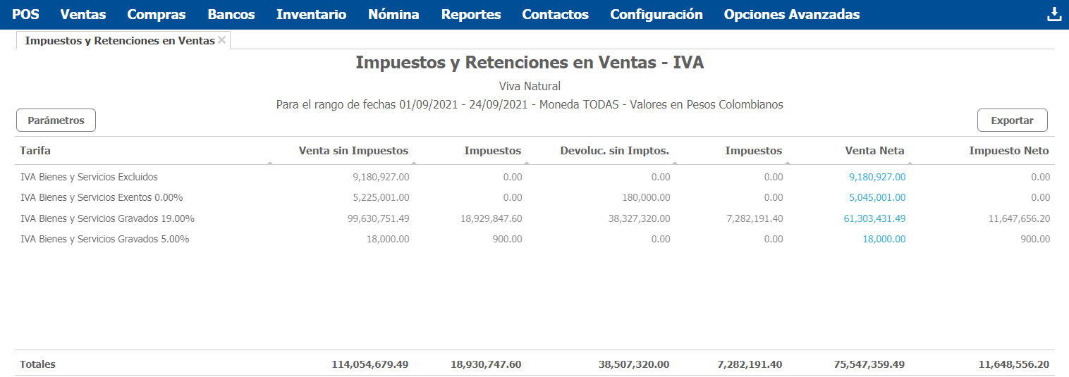 Puedes identificar diferentes columnas donde se discriminan las ventas sin impuestos, los impuestos de las ventas, las devoluciones sin impuestos y los impuestos sobre estas devoluciones.