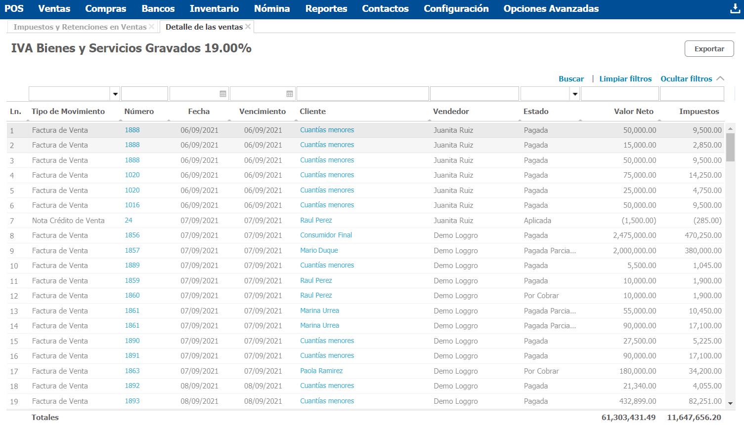 Loggro cuenta con un reporte donde puedes consultar los Impuestos y Retenciones generados en las facturas y notas crédito del módulo de ventas.