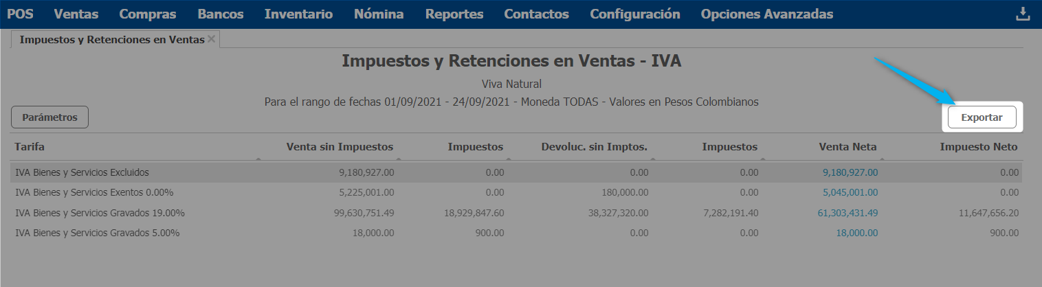 Para consultar el detalle de los Impuestos y Retenciones debes dar clic sobre uno de los registros que visualizas en color azul (campo de Venta Neta).