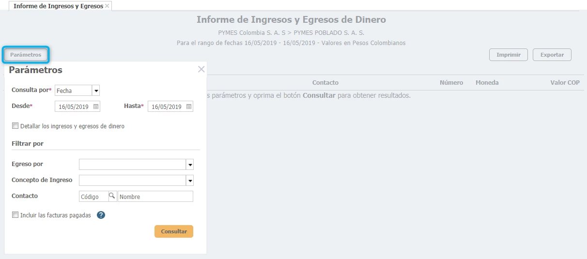 - Contacto: El sistema te permite consultar los ingresos / egresos de dinero para un tercero especifico que puedes indicar en este campo.