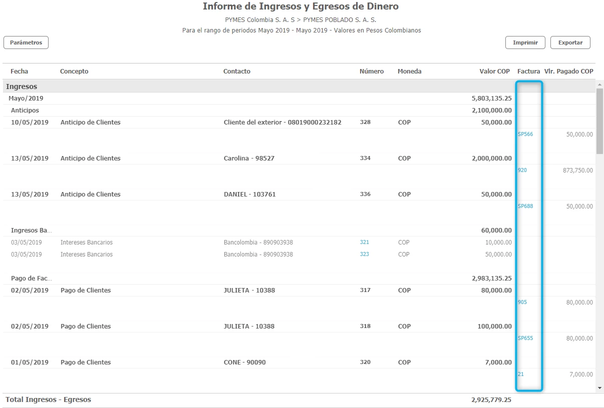 → Puedes realizar la consulta detallando los ingresos y egresos de dinero, con esto además del valor el sistema te indicará por que concepto se realizó el movimiento, el contacto y número de documento respectivo.