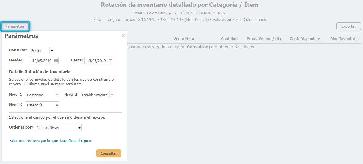 El primer paso para la construcción del reporte, es definir los parámetros de consulta. El sistema te abre la ventana de parámetros y muestra unos predeterminados, pero puedes realizar modificaciones de acuerdo a tus necesidades.