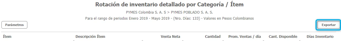 Nota: Estas son las fórmulas de cálculo para las columnas Prom. Ventas y Días Inventario
