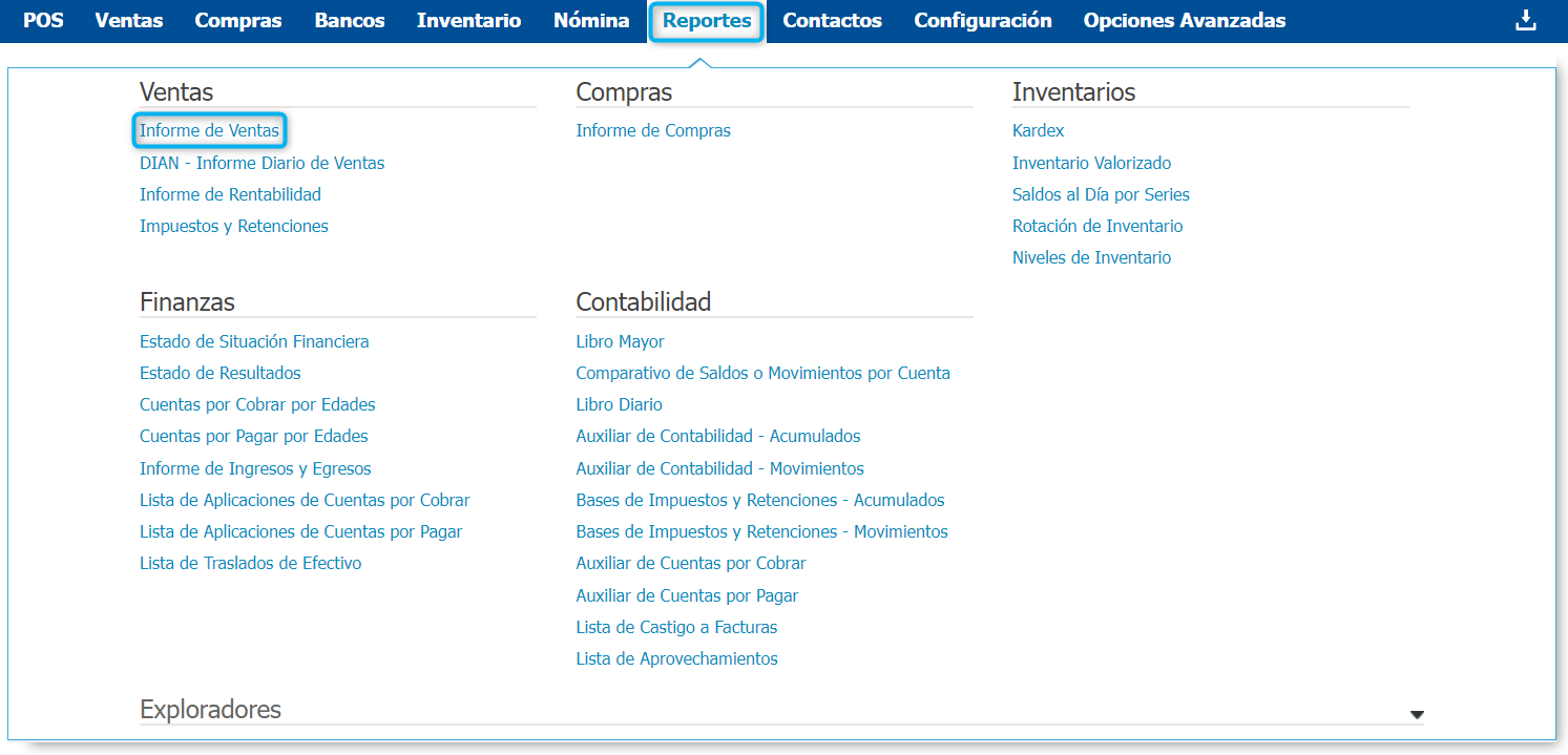 Para acceder al Informe de ventas deberás seleccionar en el menú Reportes → Informe de Ventas.