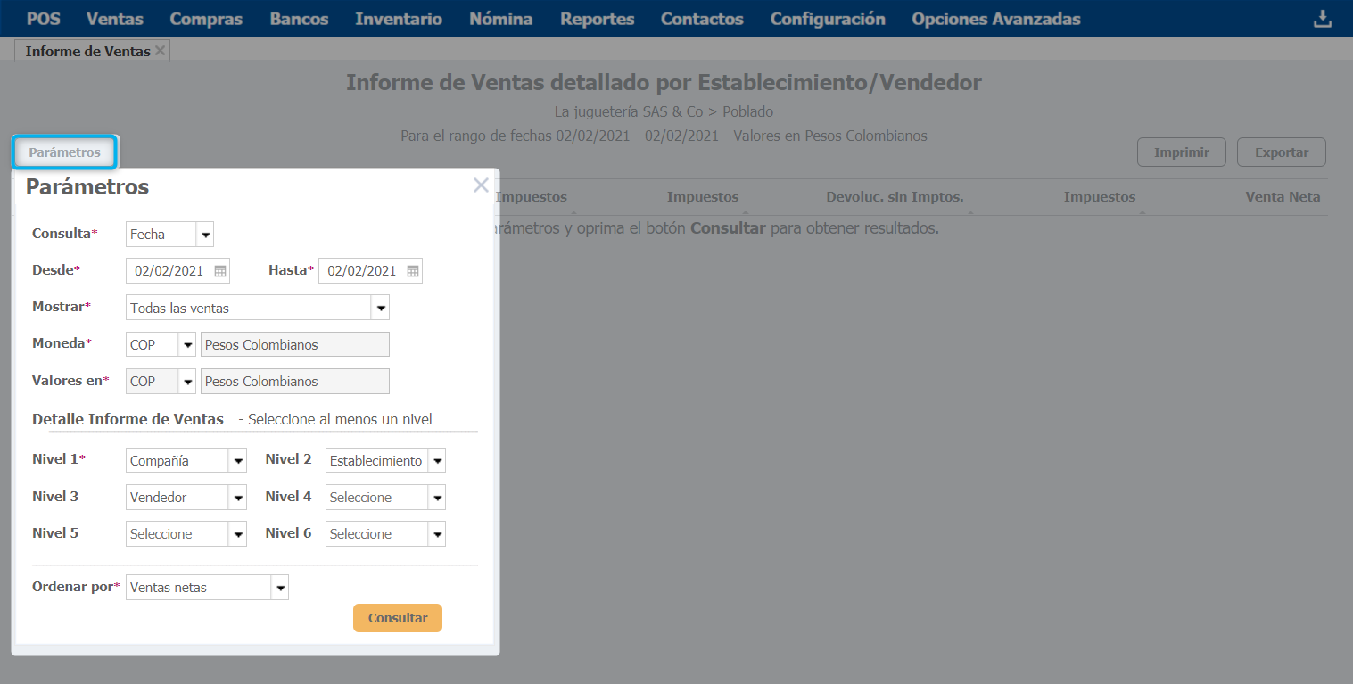De forma predeterminada se muestra la consulta por Compañía, Establecimiento y Vendedor, pero puedes modificarlos y tienes la opción de seleccionar hasta 6 niveles diferentes, con el fin que la información presentada sea mas detallada y comprensible. - Ordenar por: Puedes elegir el orden en el cual se va a mostrar el informe, al desplegar el menú encuentras las opciones respectivas.