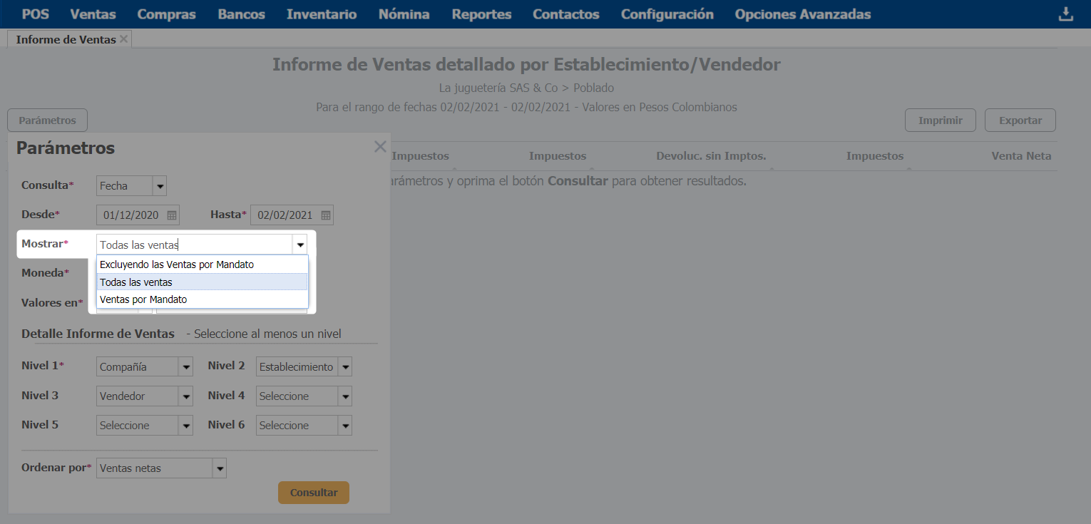 - Mostrar: En este campo puedes especificar la información de ventas que deseas que se visualice en el reporte. De forma predeterminada se muestran todas las ventas, al desplegar el menú puedes seleccionar si deseas visualizar en la consulta todas las ventas, solo las que se generaron por mandato o las ventas excluyendo aquellas que fueron por mandato.