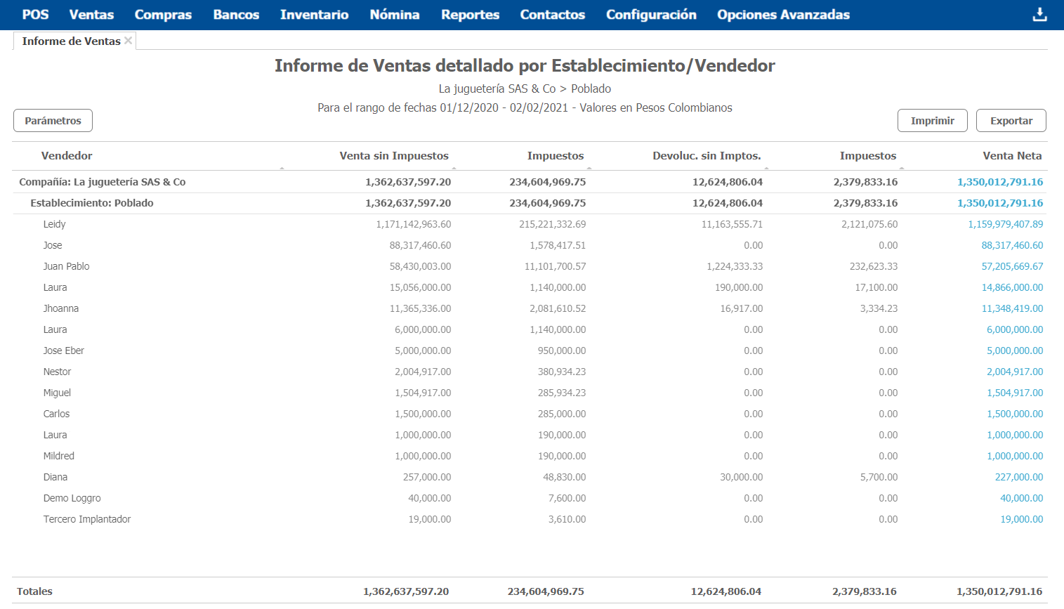 En Loggro hemos diseñado un reporte que te permitirá conocer las ventas y devoluciones realizadas en los establecimientos de tu compañía, con los respectivos valores de impuestos causados.