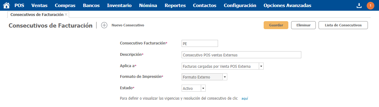 Si se van a sincronizar las facturas electrónicas: Tener configurado el consecutivo de facturación electrónica en Loggro Pymes para que aplique a Facturas cargadas por Venta Externa No POS.