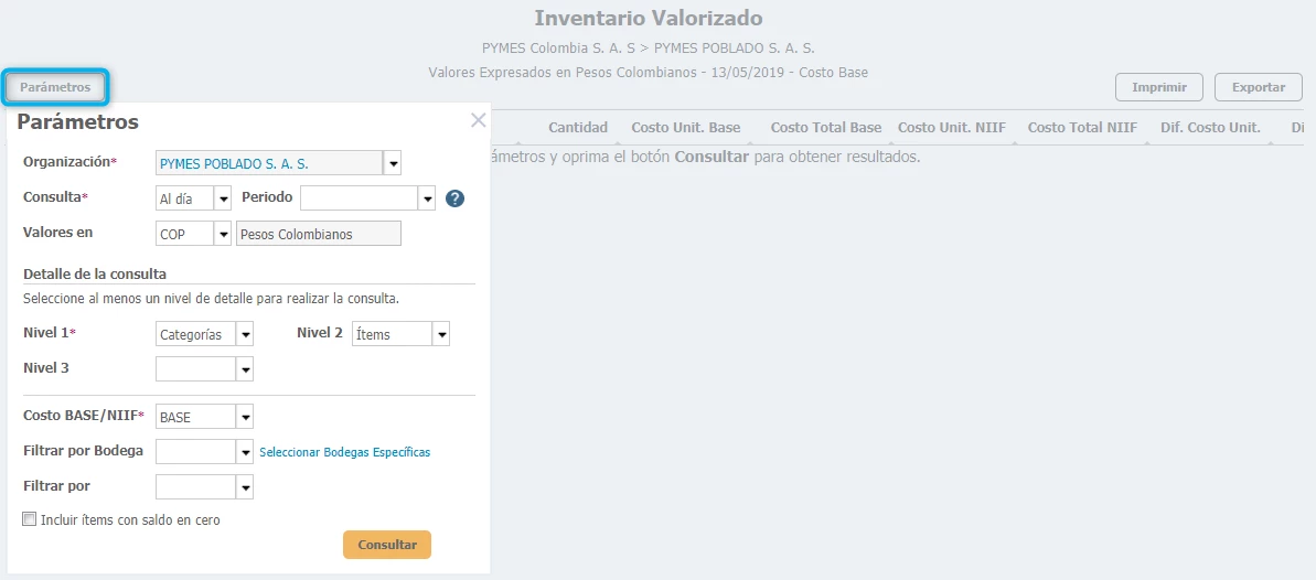 - Incluir ítems con saldo en cero: Puedes seleccionar incluir o no en el informe los ítems que no presentan disponibilidad en el sistema para el periodo consultado.