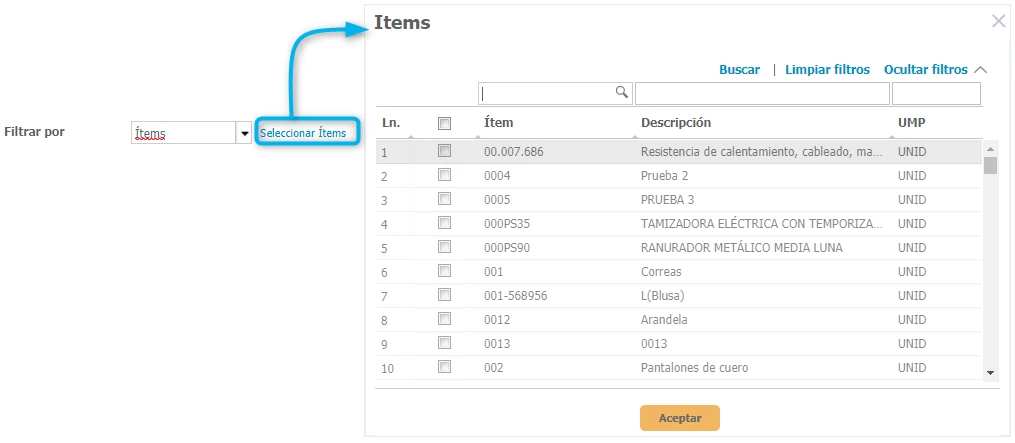 Al ingresar Filtrar por ítems, se activa el el sistema la opción para seleccionar los ítems específicos