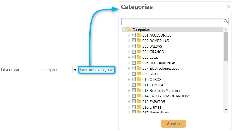 Al ingresar Filtrar por Categorías, se activa el el sistema la opción para seleccionar los ítems específicos