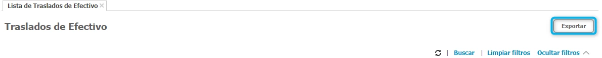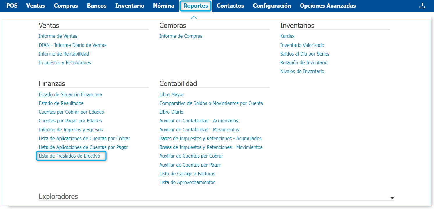 Para acceder a este informe debes dar clic en la opción Reportes → Lista de Traslados de Efectivo