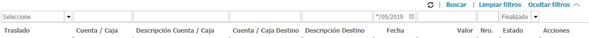 - Descripción Cuenta / Caja: Establece la descripción de la cuenta bancaria o la caja para la cual deseas visualizar los traslados realizados (desde la cual se originó el movimiento).