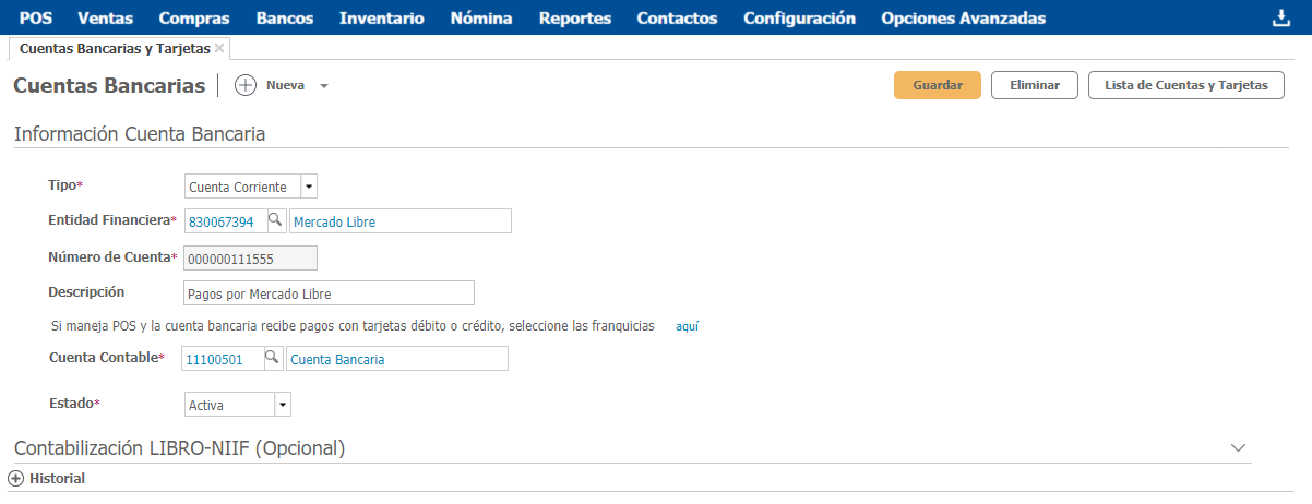 Recuerda que esta creación la realizas por Configuración → Cuentas Bancarias y Tarjetas.
