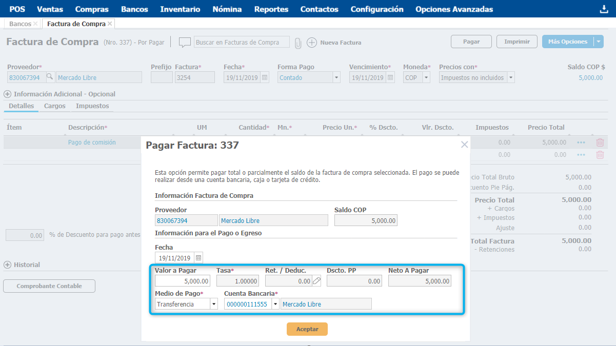 Para la comisión: Si tienes la factura de compra donde se asocia la comisión, la registras por el valor respectivo, en este caso $5.000 y para pagar lo haces relacionando la cuenta de Mercado Libre.