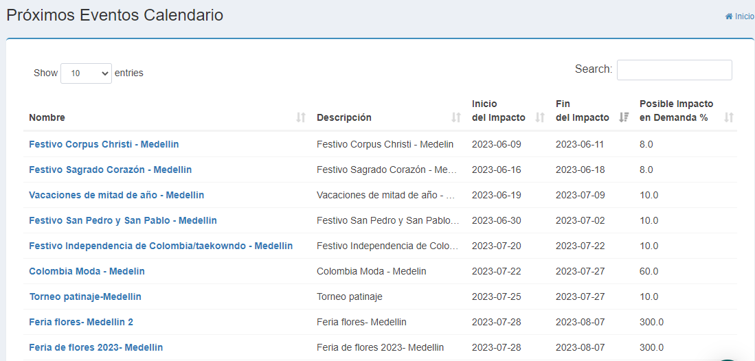 Allí encuentras los eventos que se tienen identificados van a realizarse en tu ciudad, puedes visualizar las fechas de inicio y fin del impacto del evento; así mismo el posible impacto en la demanda que va traer dicho evento.