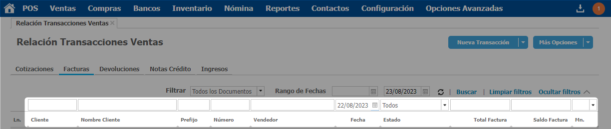 Puedes exportar las transacciones que se realizaron en el módulo de ventas ingresando a Ventas → Relación de Transacciones Ventas, el sistema te permite realizar la búsqueda de los documentos que requieres con ayuda de los filtros. Recuerda que en esta ventana encuentras información de Cotizaciones, Facturas, Devoluciones, Notas Crédito e Ingresos.