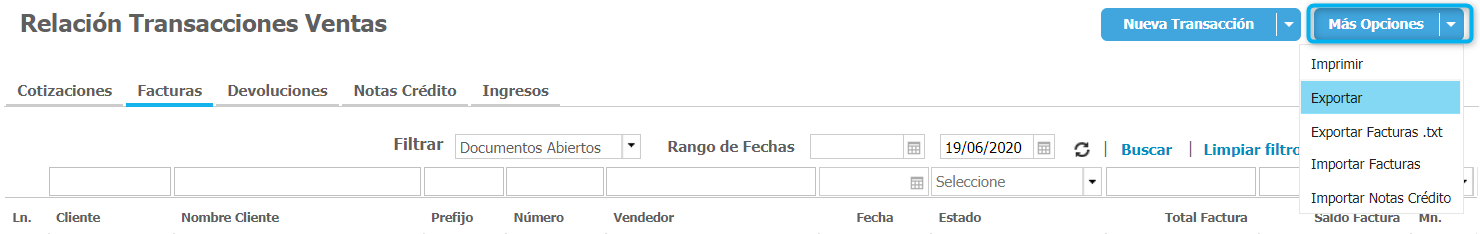 Ubicado en la ventana de Relación de Transacciones Ventas - en la pestaña de la información que desees descargar (Cotizaciones, Facturas, Devoluciones, Notas Crédito, Ingresos) da clic en Más Opciones / Exportar.