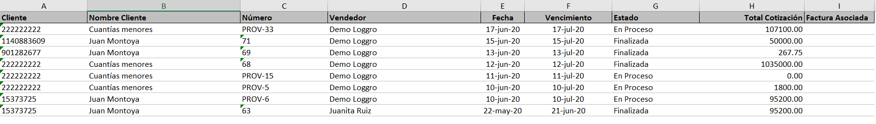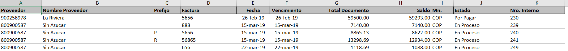 Para el ejemplo anterior se exportaría en excel el archivo con las facturas vencidas como se muestra a continuación.