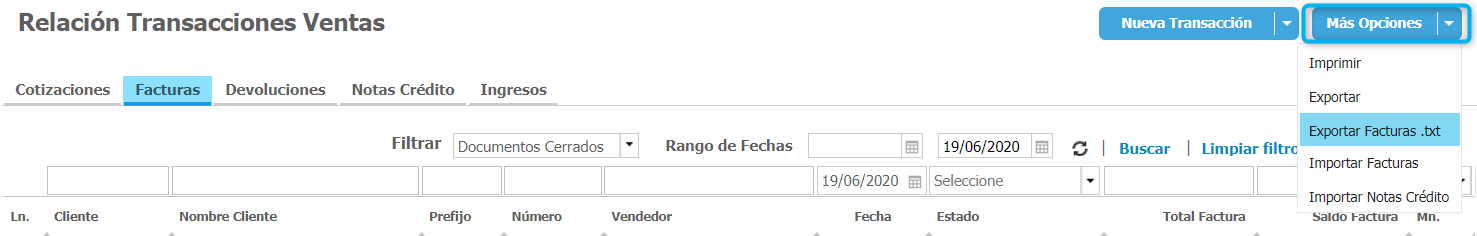 - En el caso de las facturas de venta, también tienes la opción de exportar la información como .txt desde la ventana de relación transacciones venta.
