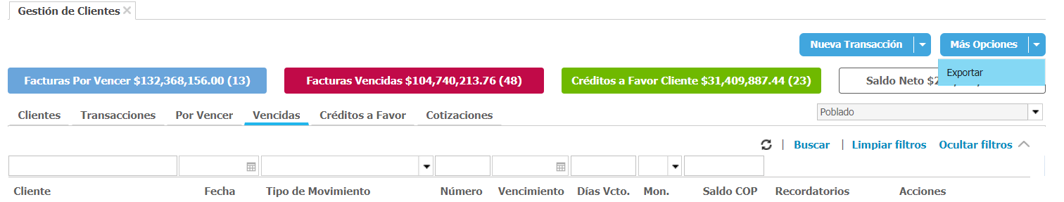 Por ultimo, puedes ingresar a Ventas → Gestión de Clientes y exportar esta información de acuerdo a la pestaña en la que estas ubicado. Solo debes dar clic en Más Opciones/Exportar.