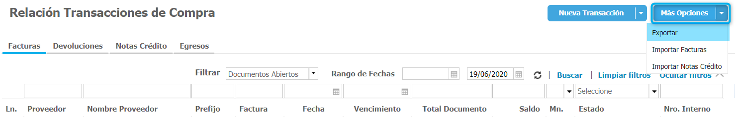 Puedes exportar las transacciones que se realizaron en el módulo de compras ingresando a Compras → Relación de Transacciones Compras, el sistema te permite realizar la búsqueda de los documentos que requieres con ayuda de los filtros. Recuerda que en esta ventana encuentras información de Facturas, Devoluciones, Notas Crédito y Egresos.