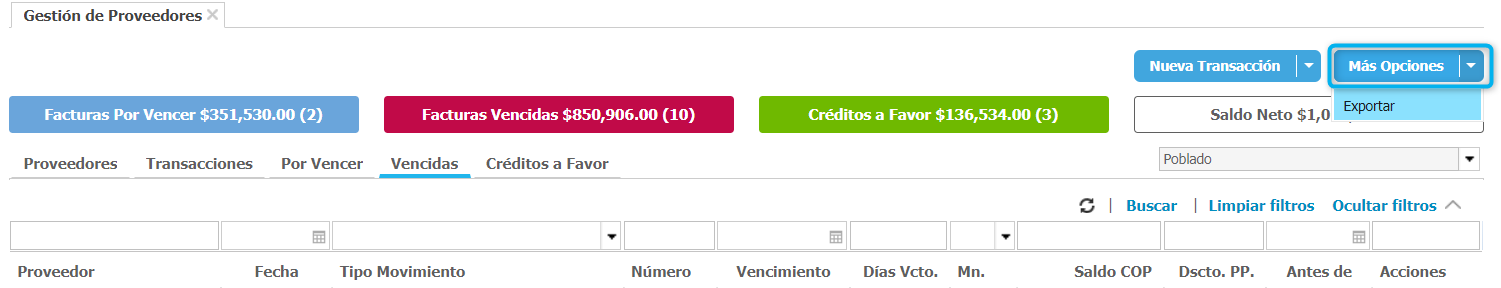 Por ultimo, puedes ingresar a Compras → Gestión de Proveedores y exportar esta información de acuerdo a la pestaña en la que estas ubicado. Solo debes dar clic en Más Opciones/Exportar.