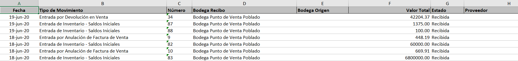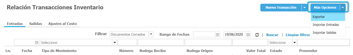 - Puedes exportar las transacciones que se realizaron en el módulo de inventario ingresando a Inventario → Relación de Transacciones Inventario, el sistema te permite realizar la búsqueda de los documentos que requieres con ayuda de los filtros. Recuerda que en esta ventana encuentras información de Entradas, Salidas y Ajustes al Costo.