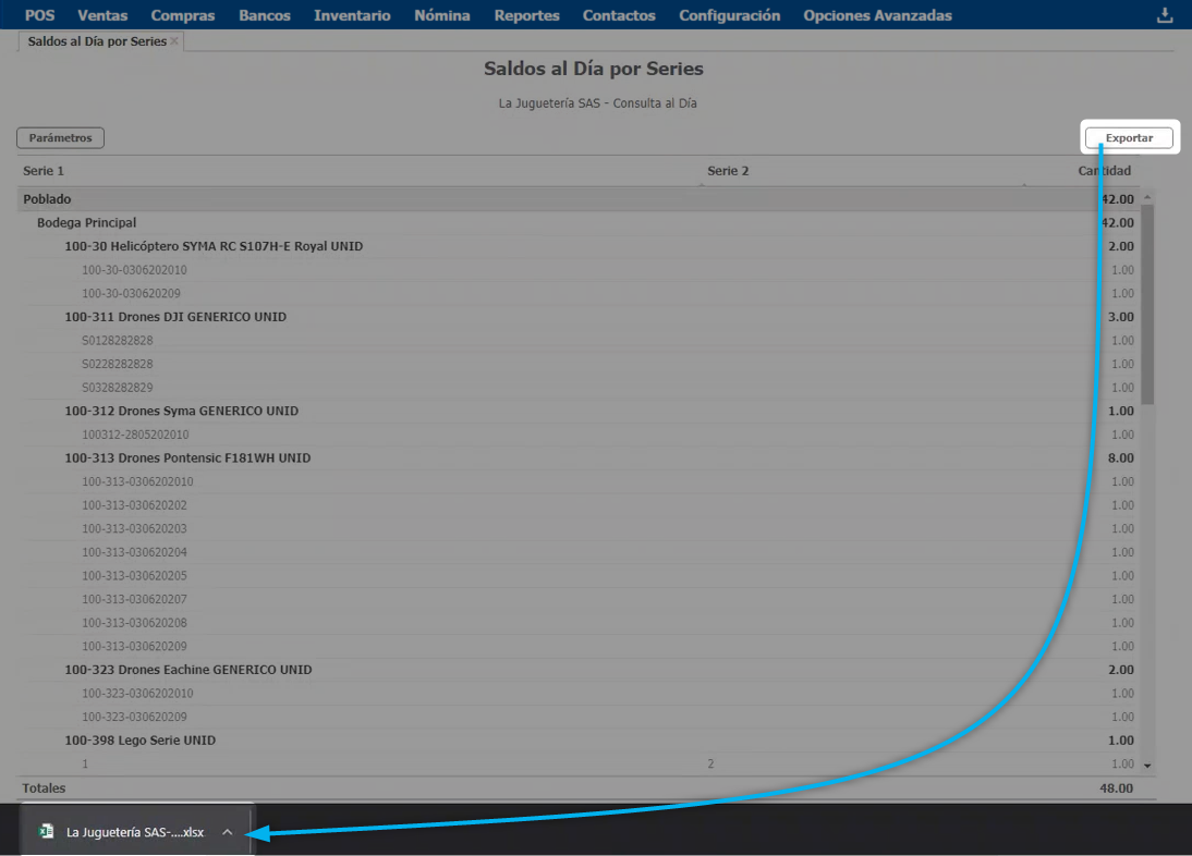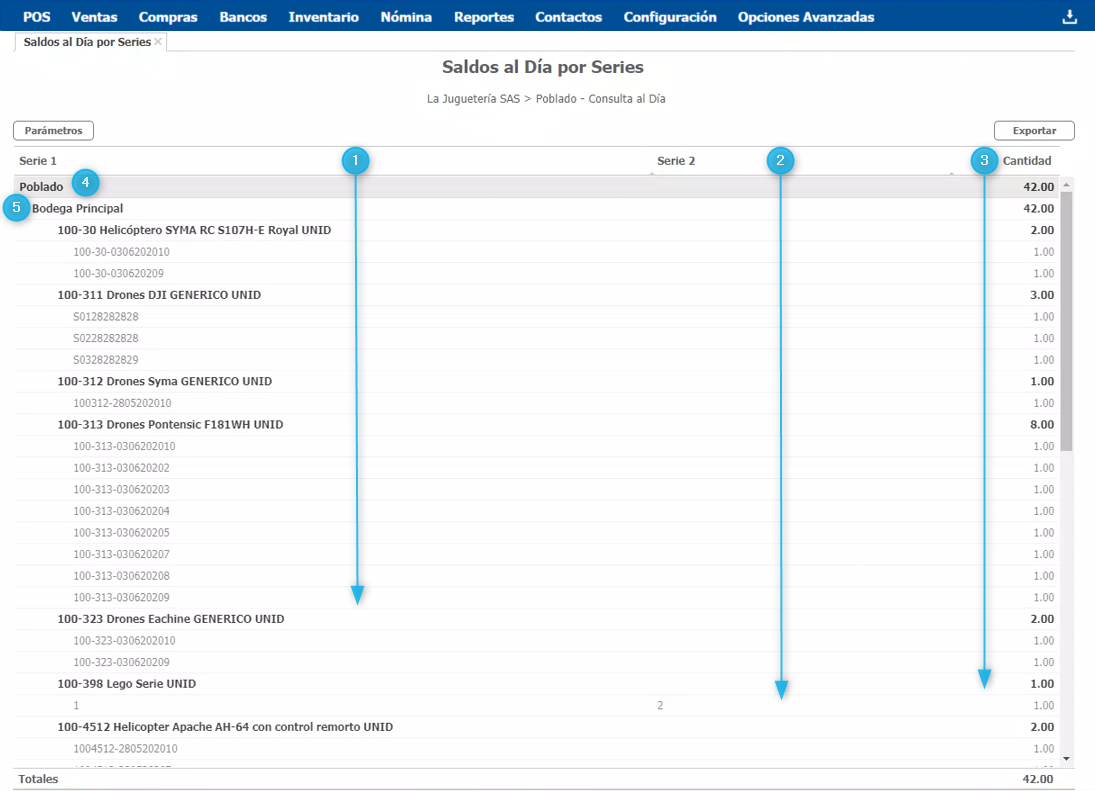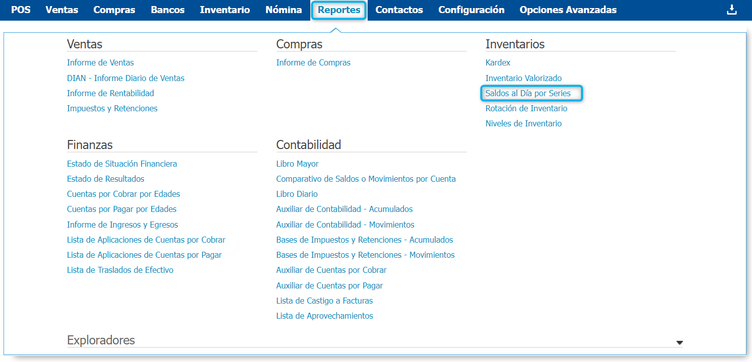 - Este reporte muestra a nivel general las cantidades existentes de cada serie, no tiene en cuenta si alguna de estas se encuentra comprometida en una transacción. Para detallar esta información puedes consultar el producto desde el explorador de Saldos al Día por Bodega.