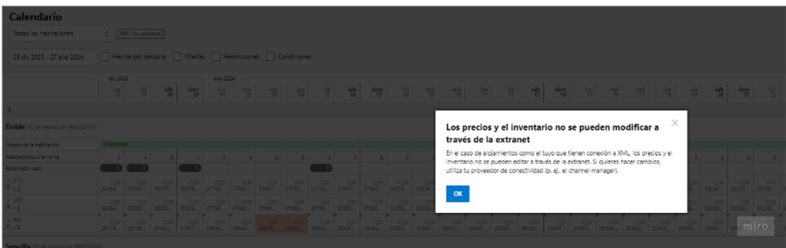 Al conectarte con nuestro Channel Manager, es importante que tengas en cuenta que cualquier cambio de precio y/o de inventario de tus habitaciones, deberá realizarse desde nuestro PMS. Al realizar dichos cambios, éstos viajarán a las plataformas conectadas y se actualizarán todas en simultáneo. En caso de que intentes realizar cambios desde la extranet de Booking no te lo va permitir y te mostrará el siguiente mensaje.